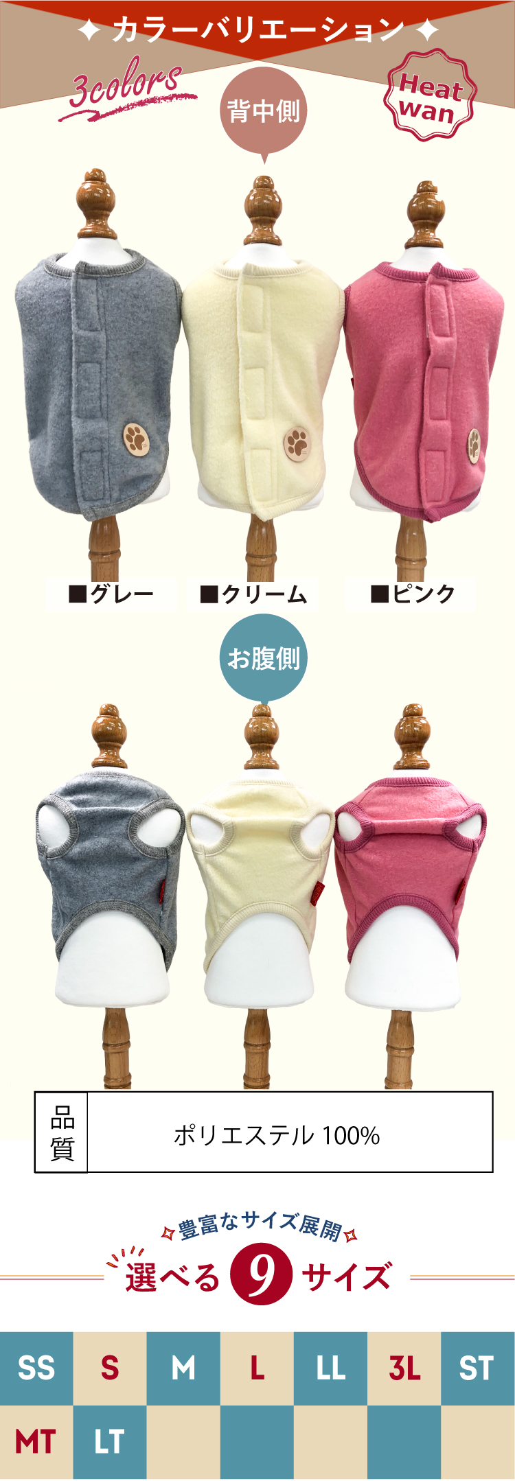 2025年クークチュール秋冬新作登場♪ 蓄熱・保温効果に優れた温感素材といわれる「プレサーモC-31加工」。 「薄くて軽いのに温かい」。ヒートワンの最大の特徴です。 着るだけで、心地良い暖かさを実現した「ヒートワン」は 「抗菌・防虫加工」が加わりダブル機能に。 このEXヒートワンは更に温かく背中がマジックテープ付きなので着脱もカンタン。 寒がりなワンちゃんかぶりウェアが苦手なワンちゃんに特におすすめします。 SS/S/M/L/LL/3L/ST/MT/LTサイズあります。 FBM/FBL/XL/JL/SLサイズはありません。