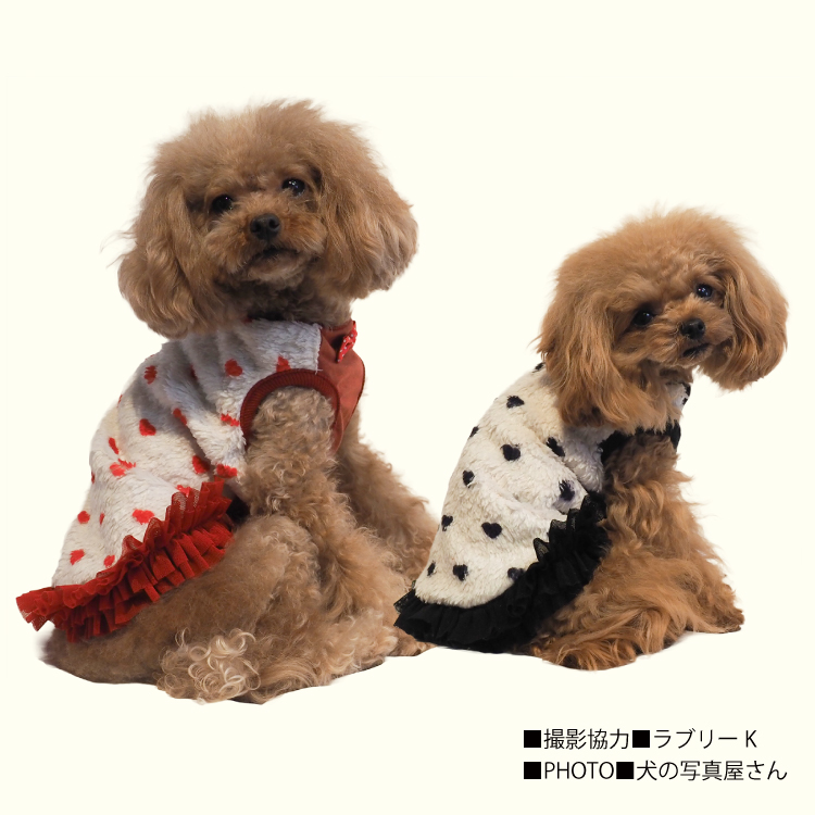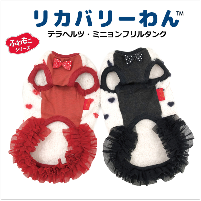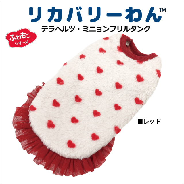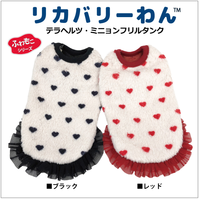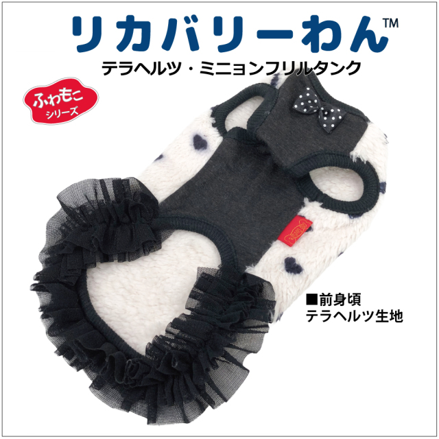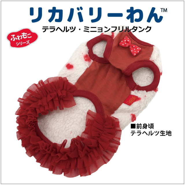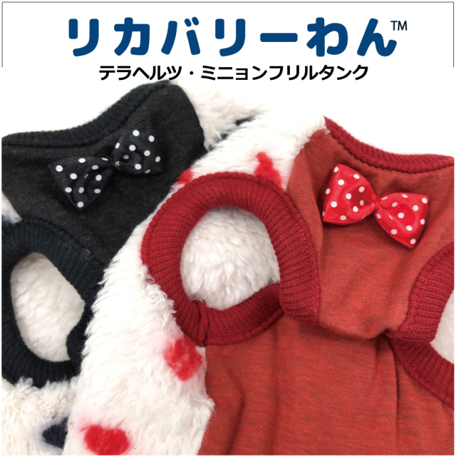 2025年クークチュール秋冬新作登場♪ 究極のパワーストーンといわれるテラヘルツ人工鉱石を配合した生地を使用しています。 ワンちゃんの体の事を考えて作った機能素材「リカバリーわん」シリーズ。 テラヘルツは身体の弱い部分に働きかける作用があります。 浸透能力に優れており、健康を促す働きをすると言われています。 リカバリーウェアとしてすべてのワンちゃんにおすすめですが特にシニアや病気がちのワンちゃんに 効果を発揮するということで介護補助ウェアとしてもご使用いただけます。 プチハート柄が可愛いフリルタンク。表はふわふわのボア。 裏側はテラヘルツ生地。同じ柄のハーネス、マットもあります。