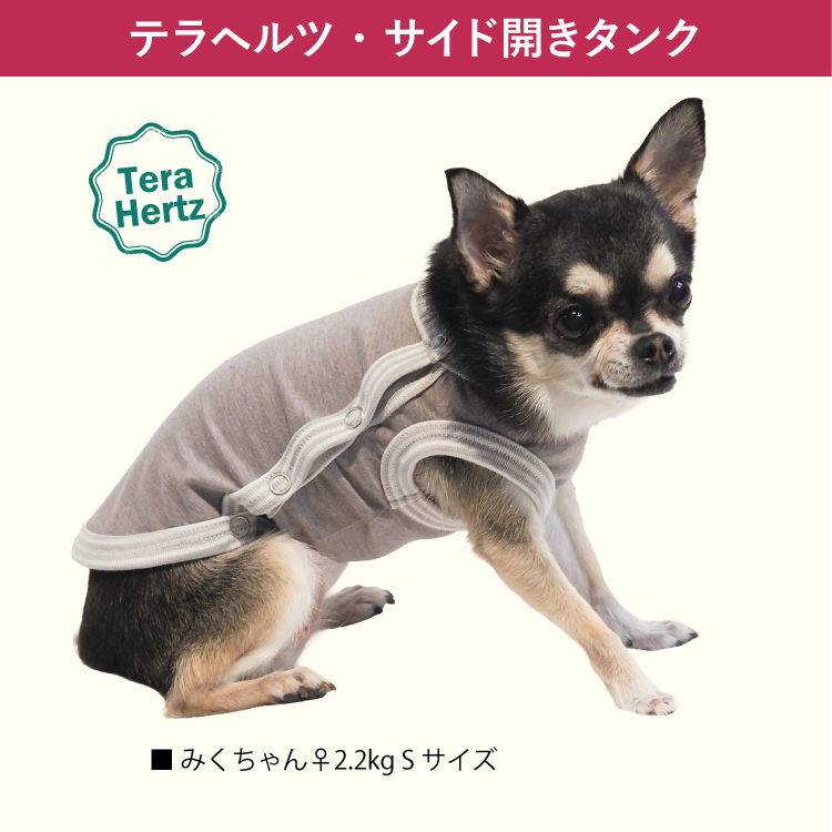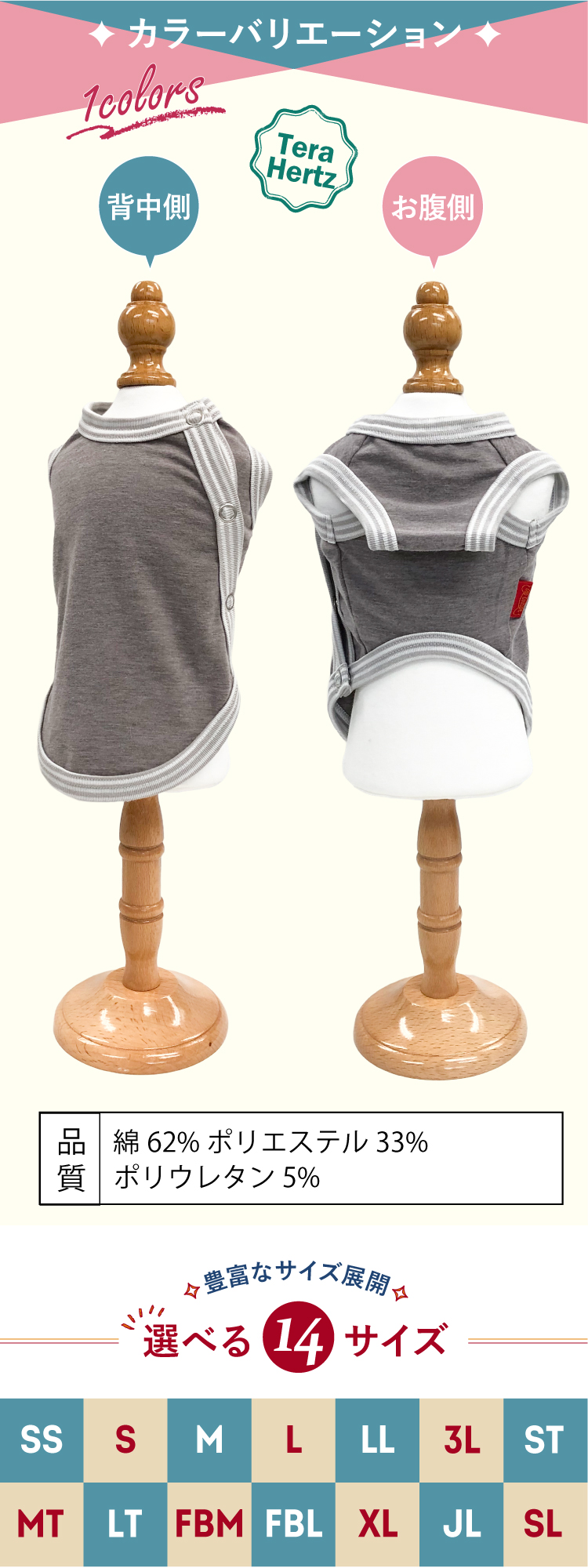 「着るだけで、愛犬のコンディションを整える。」 究極のパワーストーンといわれるテラヘルツ人工鉱石を配合した生地を使用しています。 ワンちゃんの体の事を考えて作った機能素材「リカバリーわんTM」シリーズ。 テラヘルツは身体の弱い部分に働きかける作用があります。浸透能力に優れており、健康を促す働きをすると言われています。 お散歩が好きな子にも、年齢を重ねたシニア犬にも。 “着るケア”で、愛犬の健康をもっと長く、もっとやさしく守ります。 このタンクトップはサイドボタンを外せば全開するのでウェア着用時のワンちゃんにストレスがかかりません。かぶりが苦手なワンちゃん、シニアワンちゃんの介護補助ウェアとしてお役立てください。 同じ仕様のパジャマもあります。生地が薄くて伸びが良く1年中着られます。 SS/S/M/L/LL/3L/ST/MT/LT/FBM/FBL/XL/JL/SLサイズあります。