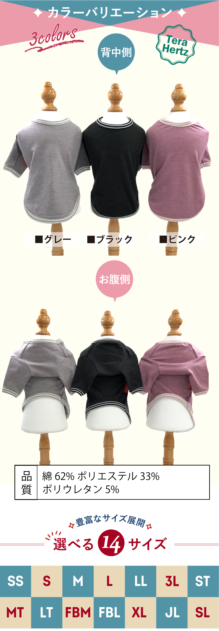 「着るだけで、愛犬のコンディションを整える。」 究極のパワーストーンといわれるテラヘルツ人工鉱石を配合した生地を使用しています。 ワンちゃんの体の事を考えて作った機能素材「リカバリーわんTM」シリーズ。 テラヘルツは身体の弱い部分に働きかける作用があります。 浸透能力に優れており、健康を促す働きをすると言われています。 お散歩が好きな子にも、年齢を重ねたシニア犬にも。 “着るケア”で、愛犬の健康をもっと長く、もっとやさしく守ります。 このTシャツは発売以来ロングセラーを誇る大ヒット商品。 生地が薄くて伸びが良く1年中着られます。 タンクトップもあります。 SS/S/M/L/LL/3L/ST/MT/LT/FBM/FBL/XL/JL/SLサイズあります。