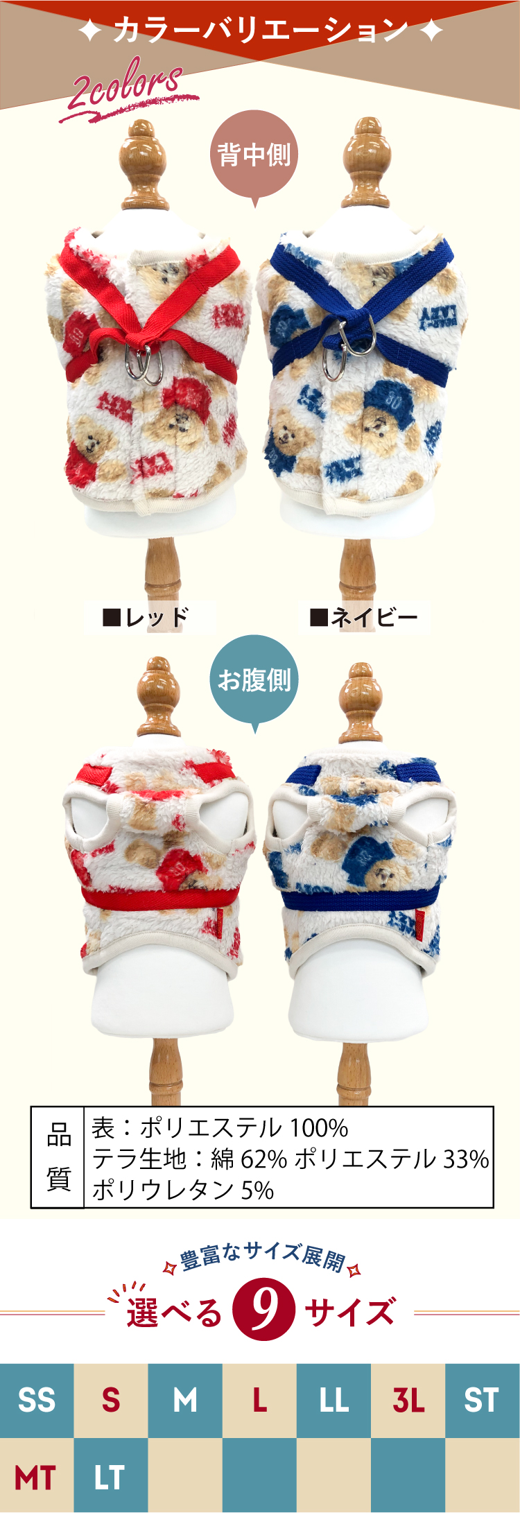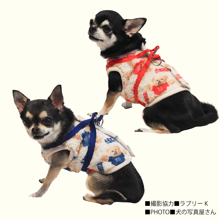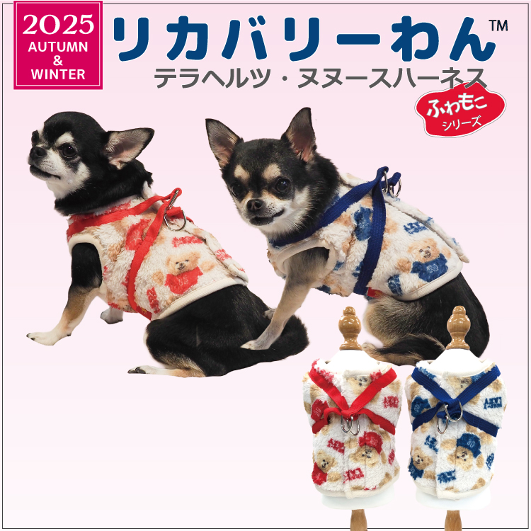 2025年クークチュール秋冬新作登場♪ 究極のパワーストーンといわれるテラヘルツ人工鉱石を配合した生地を使用しています。 「着るだけで、愛犬のコンディションを整える。」 究極のパワーストーンといわれるテラヘルツ人工鉱石を配合した生地を使用しています。 ワンちゃんの体の事を考えて作った機能素材「リカバリーわんTM」シリーズ。 テラヘルツは身体の弱い部分に働きかける作用があります。浸透能力に優れており、健康を促す働きをすると言われています。 お散歩が好きな子にも、年齢を重ねたシニア犬にも。 “着るケア”で、愛犬の健康をもっと長く、もっとやさしく守ります。 定番人気のボーダーハーネス。背中がふかふかのボア生地。前身頃はテラヘルツ生地使用。 クークチュールのハーネスは太いマジックテープでしっかり留まる。お散歩や外出、旅行に最適。