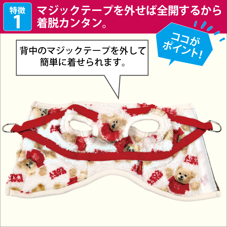 クークチュールのハーネスは太いマジックテープでしっかり留まる。