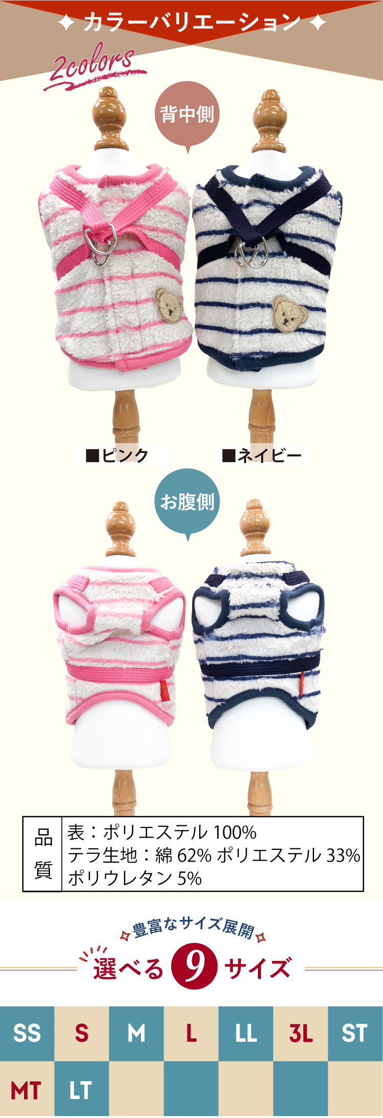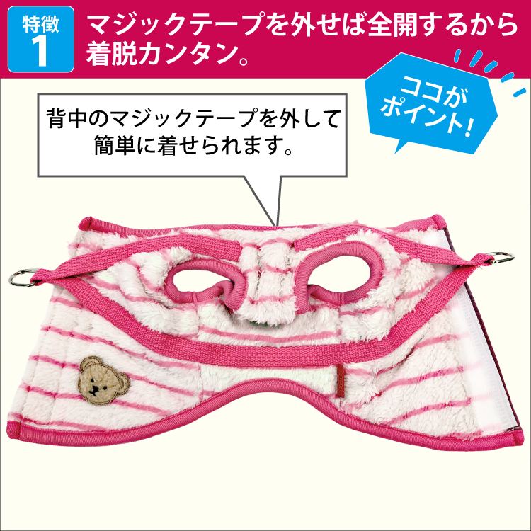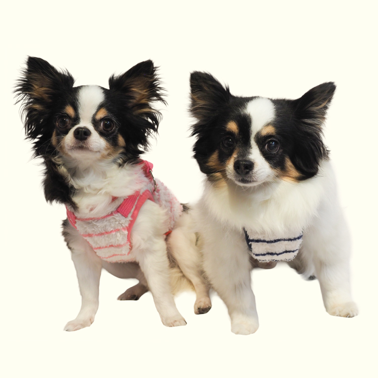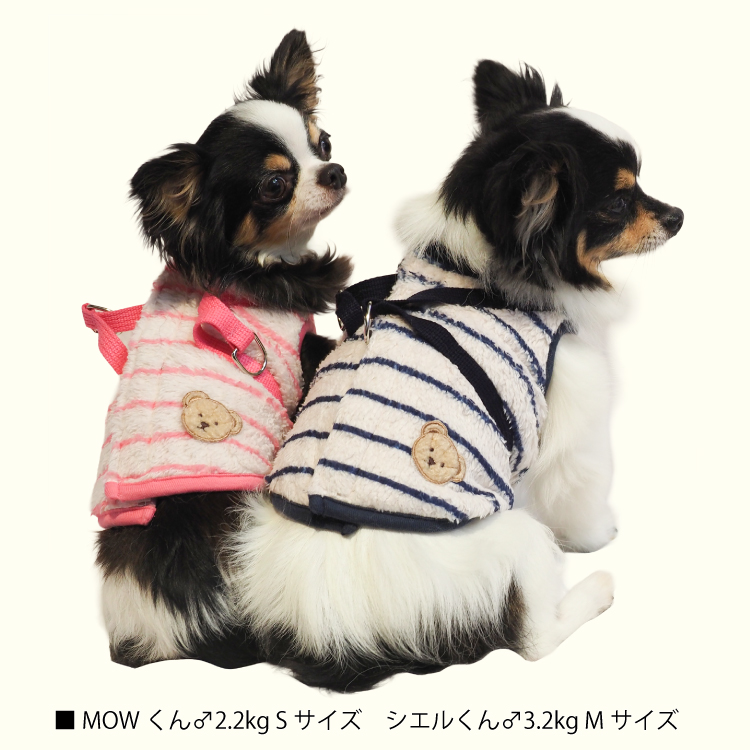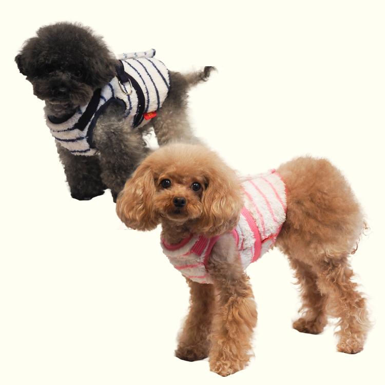 2025年クークチュール秋冬新作登場♪ 究極のパワーストーンといわれるテラヘルツ人工鉱石を配合した生地を使用しています。 ワンちゃんの体の事を考えて作った機能素材「リカバリーわん™」シリーズ。 テラヘルツは身体の弱い部分に働きかける作用があります。 浸透能力に優れており、健康を促す働きをすると言われています。 リカバリーウェアとしてすべてのワンちゃんにおすすめですが特にシニアや病気がちのワンちゃんに 効果を発揮するということで介護補助グッズとしてもご使用いただけます。 定番人気のボーダーハーネス。背中がふかふかのボア生地。前身頃はテラヘルツ生地使用。 クークチュールのハーネスは太いマジックテープでしっかり留まる。お散歩や外出、旅行に最適。